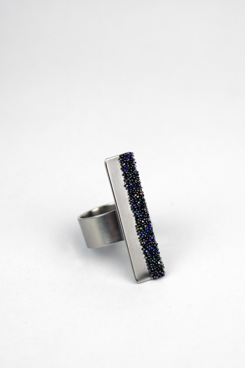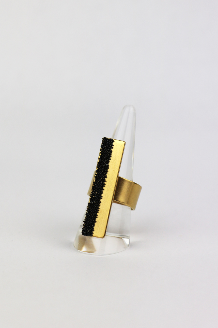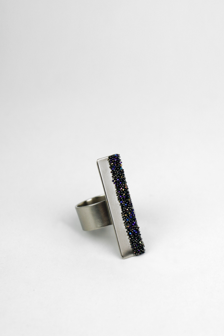 Bague femme en forme d’une barre rectangulaire, en laiton plaqué argent et Swarovski.