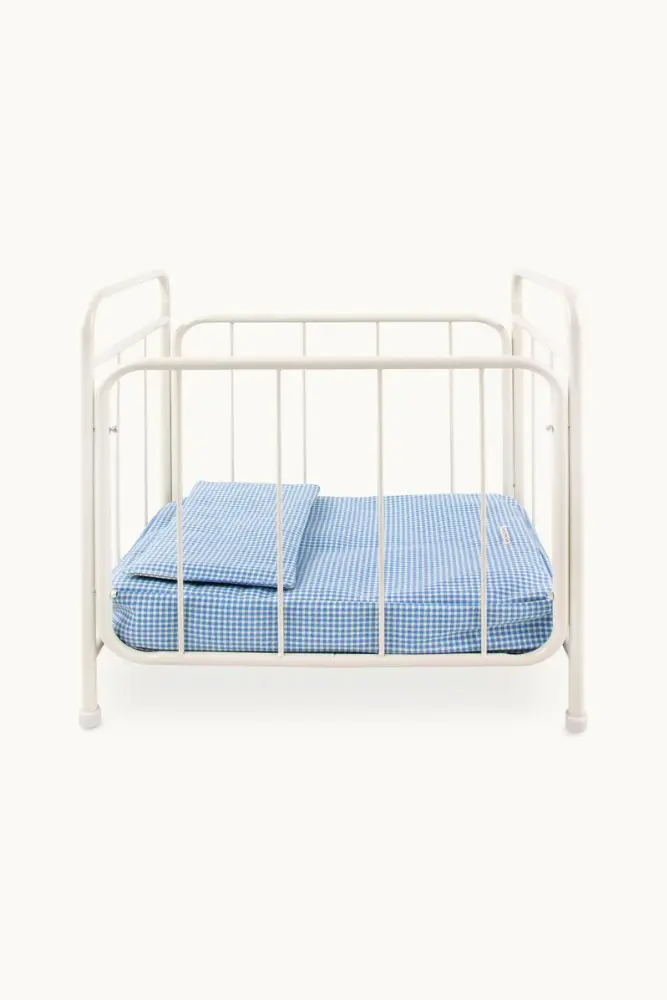Le joli berceau We are Gommu. Fabriqué en toile 100% coton avec un joli imprimé Vichy bleu et crème. Le berceau comprend 1 matelas et 1 oreiller.