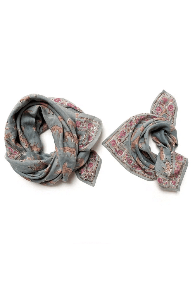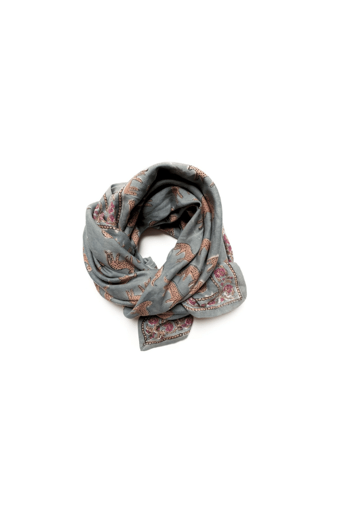 Le grand foulard Bengale Céladon d’Apaches Collections. Confectionné grâce à la technique du « block print » chaque foulard est unique. Le petit modèle (50 x 50 cm) disponible en cliquant ici.