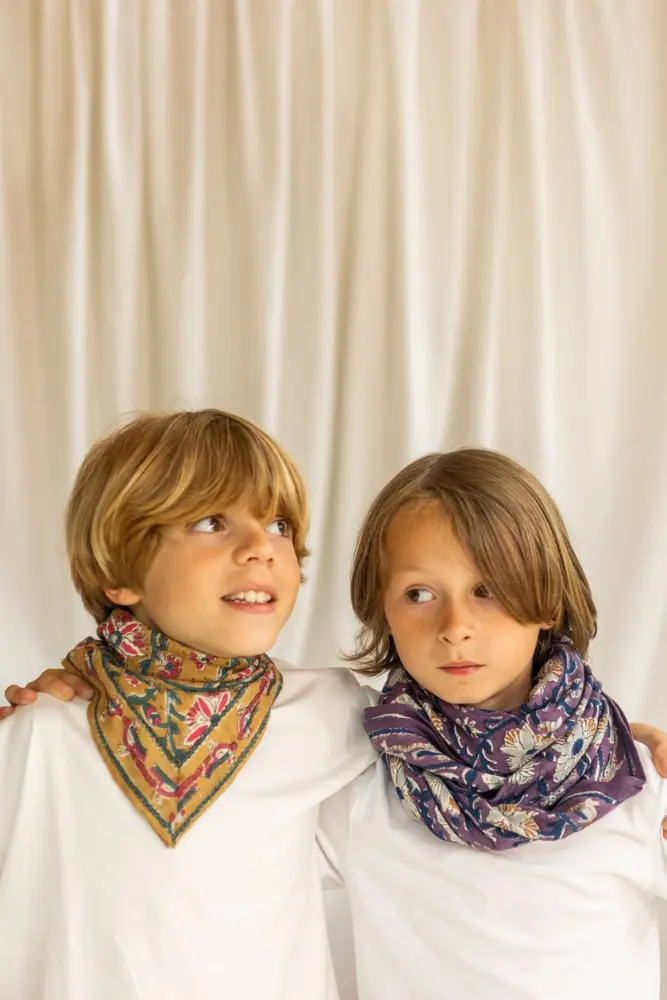 Le foulard à l’imprimé Bird de la marque Apaches Collection. Convient parfaitement à toute la famille, complète un look. Les foulards sont imprimés avec la technique du block print, les rendant unique.