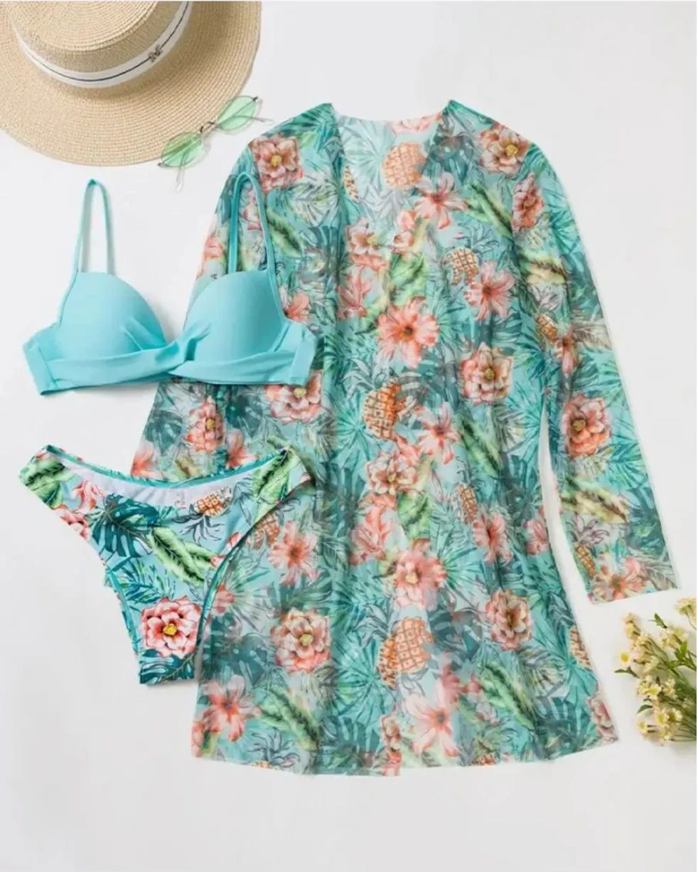 Maillot de bain 3 pièces au design tropical et féminin. Haut bandeau croisé turquoise pour un maintien élégant sans armatures. Bas taille haute imprimé, coupe flatteuse qui affine le ventre et souligne la silhouette. Kimono léger assorti en voile transparent, parfait pour un look chic à la plage ou à la piscine.