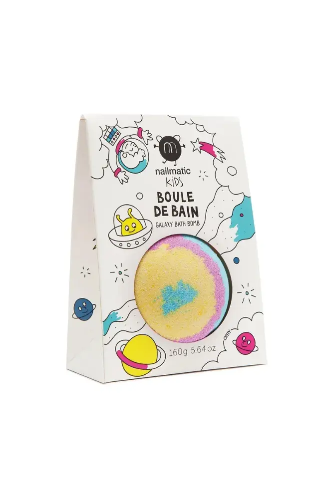 La boule de bain effervescente Galaxy offre une évasion haute en couleurs et en bulles ! Respecte la peau fragile des petits. Sans conservateur, Vegan, Cruelty Free.