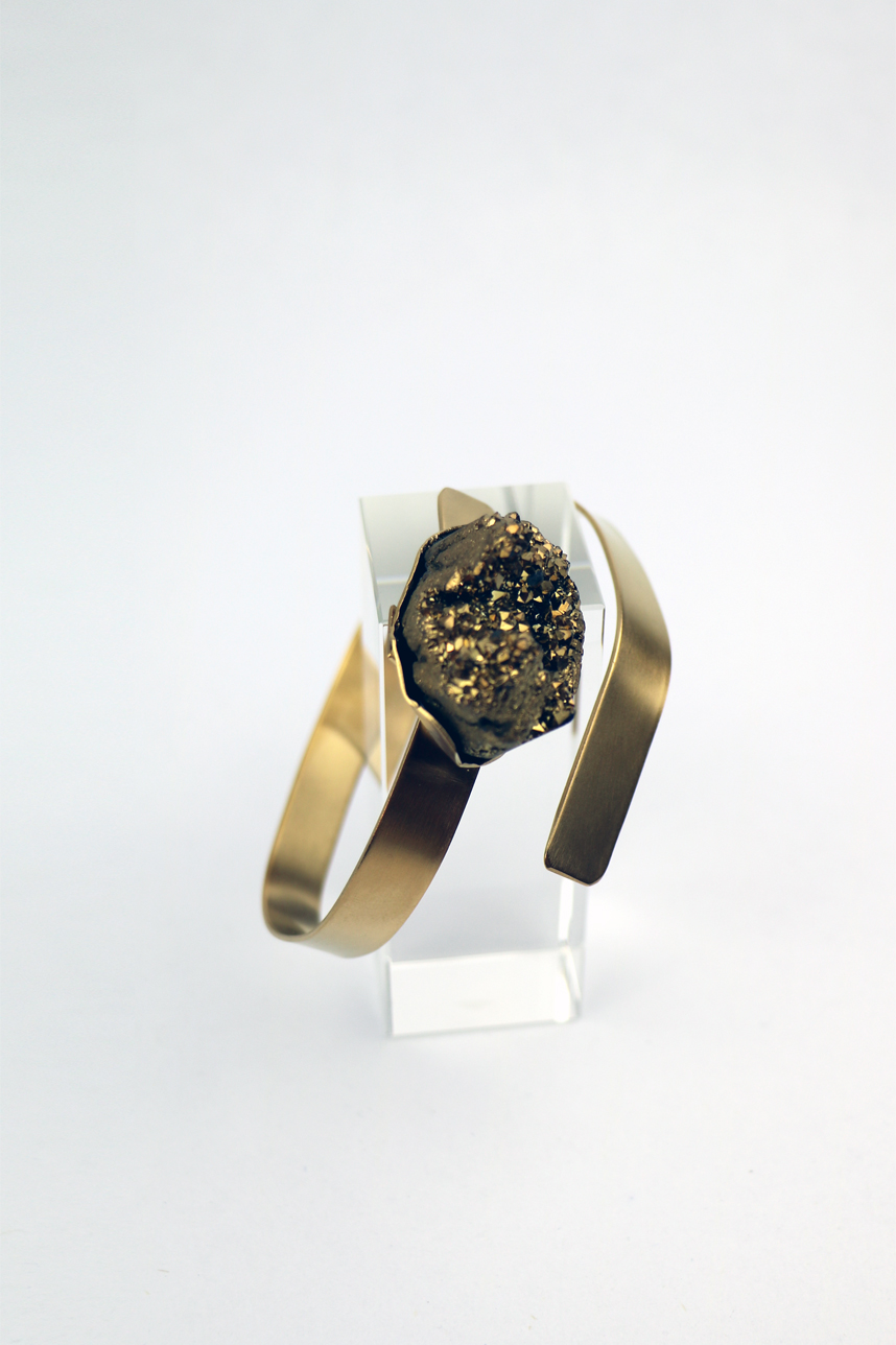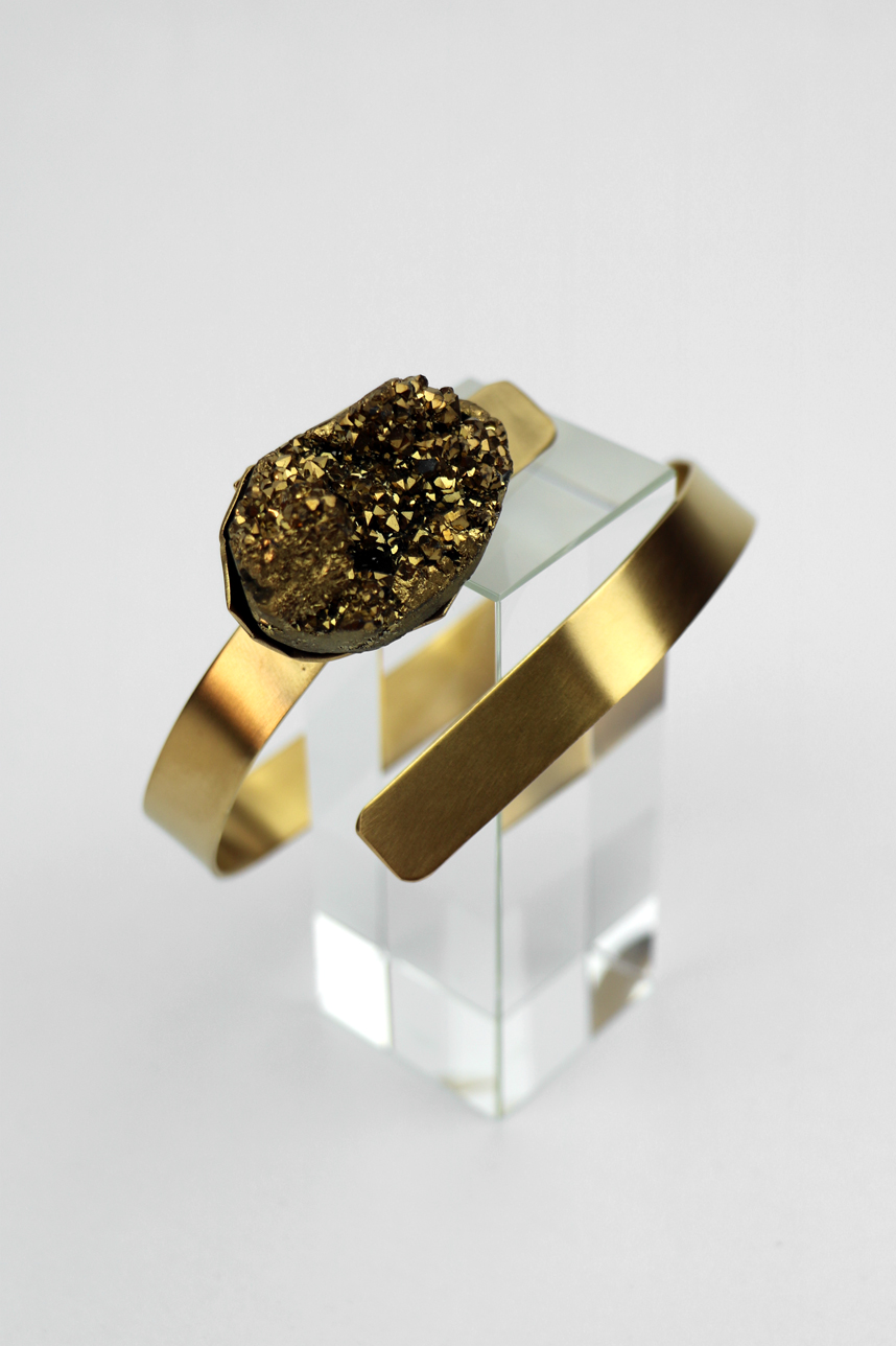 Bracelet manchette femme en feuille de laiton plaquée or, avec une pierre semi précieuse dorée, fait main.