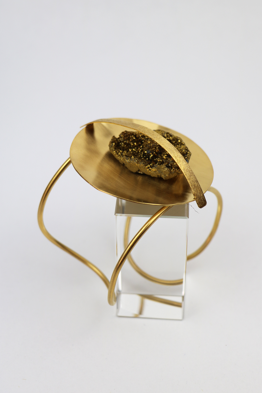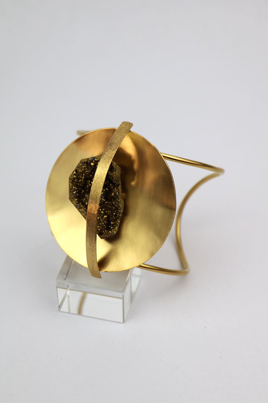 Bracelet manchette femme sphère graphique en laiton plaqué or avec une pierre semi précieuse Dorée, fait main.