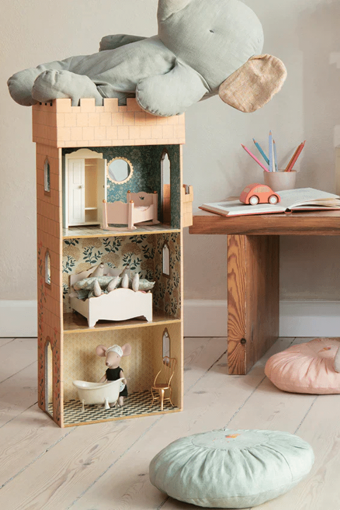 Découvrez le tour du château pour toutes les souris. Fabriqué de carton et recouvert d’impressions Maileg uniques. Au deuxième étage, un balcon et un mirroir sur le mur sont intégrés. Décorez cette tour avec vos accessoires et meubles préférés.