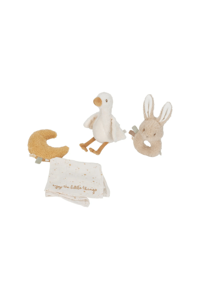 Contient : Une peluche oie – un hochet lapin – une lune lange