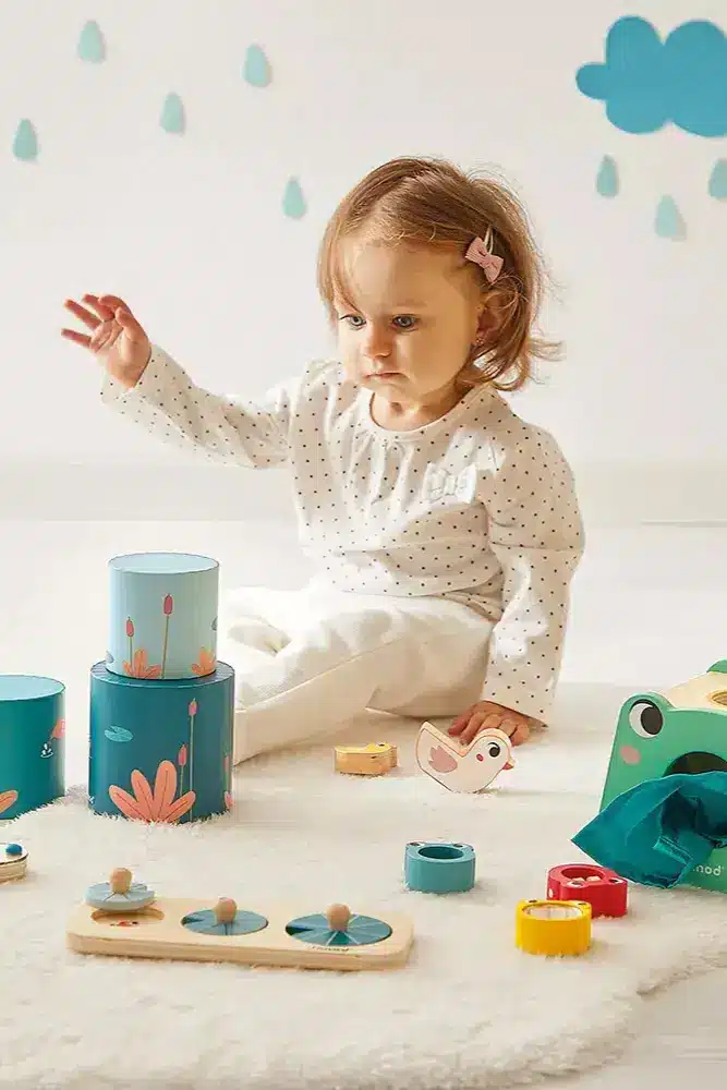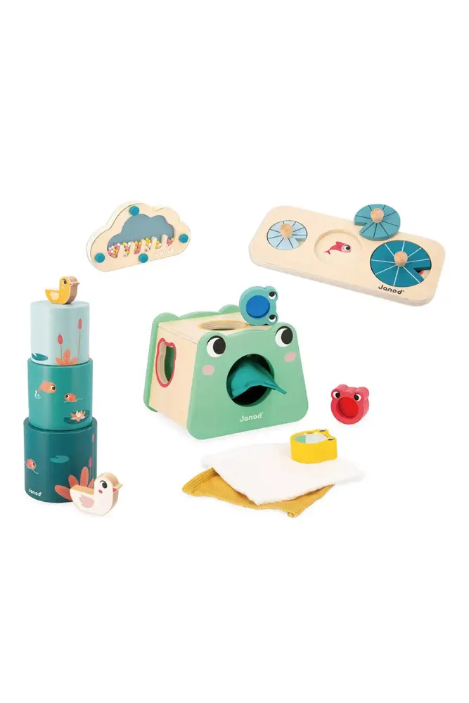 La box de Jouets 12 mois a été conçue par Janod. Elle se compose de 4 jouets ludiques spécialement adaptés à l’âge de votre enfant. Vous trouverez dans cette box une boite à forme en bois, une pyramide en trois parties, un bâton de pluie et un puzzle. La boîte à formes se compose d’une boîte à l’effigie d’une grenouille avec 3 bébés à encastrer. Chaque forme proposera des activités sensorielles et couleurs différentes. La pyramide sur le thème de la mare est composée en 3 parties avec 2 canards. Elle sera parfaite pour stimuler la motricité fine et les…