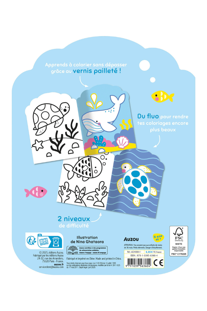 Découvrez ce coloriage sur le thème des animaux de la mer avec deux niveaux de difficulté. Le premier niveau pour apprendre à bien colorier sans dépasser avec l’aide du vernis à paillettes et le deuxième niveau sans vernis à paillettes pour montrer ses talents.