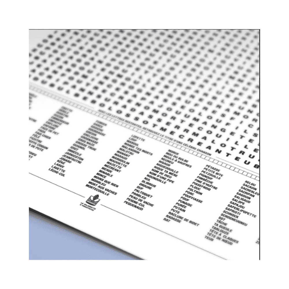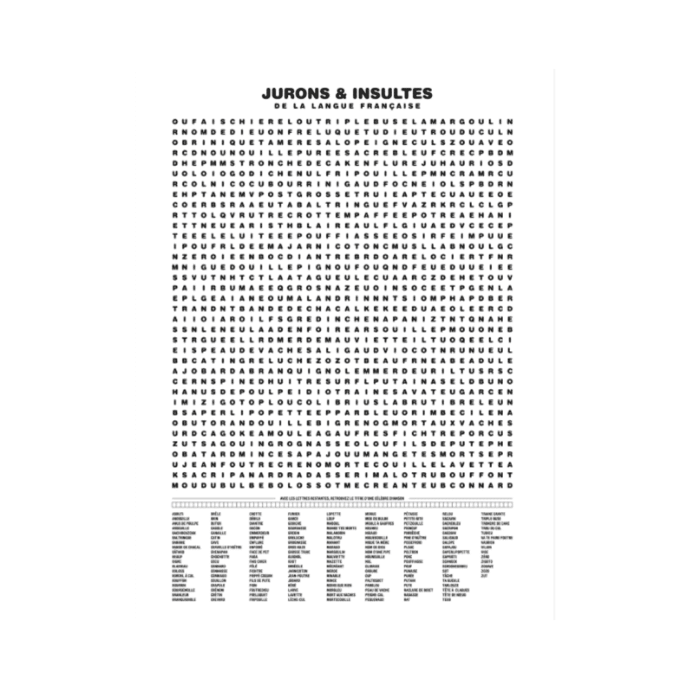 Compilations des jurons, DES MOTS MÊLÉS ORIGINAUX : Décalée et ludique, cette affiche recense une vaste collection des nombreux gros mots de la langue française, des plus curieux aux plus vulgaires en passant par les jurons tombés en désuétude.