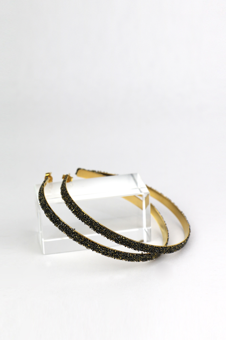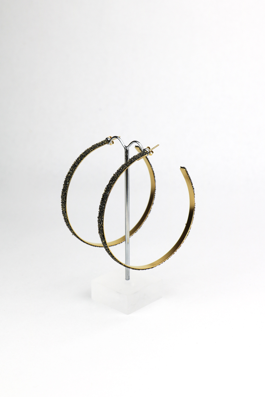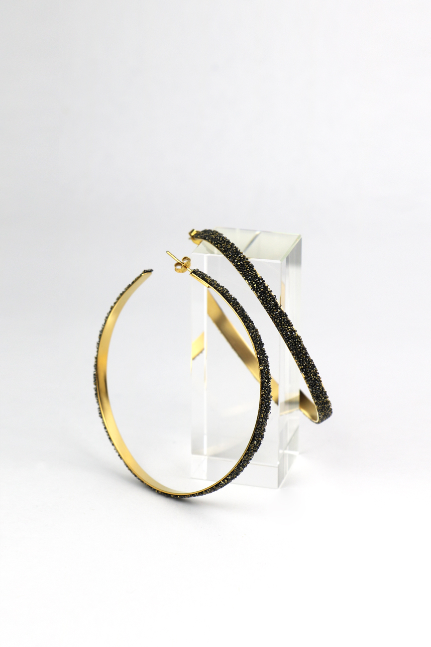 Boucles d’oreilles femme, grande forma, en laiton plaqué or saupoudré de Swarovski.