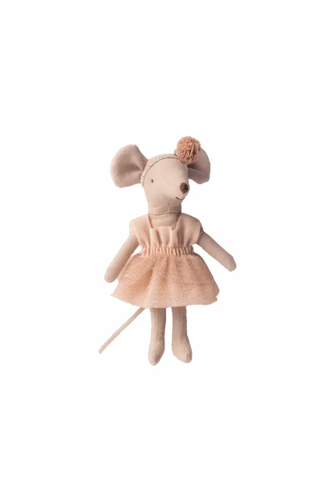 La petite souris danseuse Giselle Maileg porte une robe en tulle nude et un bandeau à pompon. La souris a des aimants au bouts de ses mains pour faire ses chorégraphies.