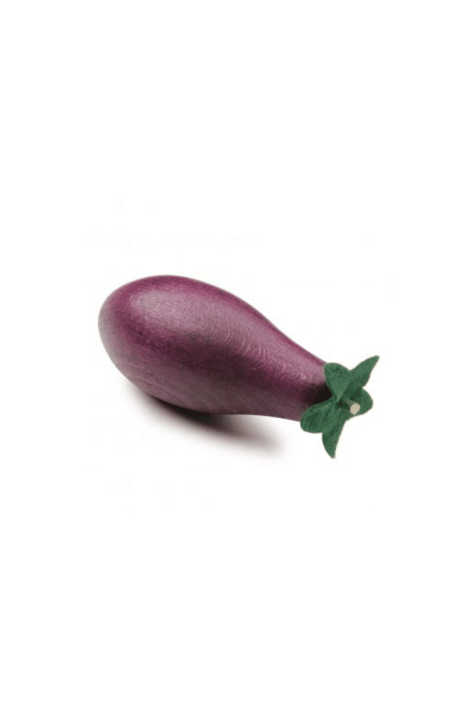 Une jolie petite aubergine en bois pour jouer et compléter un set de dinette pour enfant ou pour jouer à la marchande.
