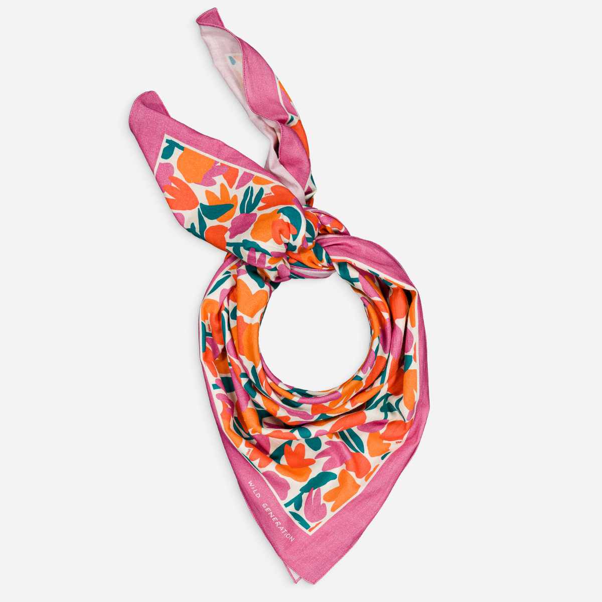 Le duo contient un foulard enfant (50×50 cm) et un foulard adulte (100×100 cm) Couleurs : violet, orange et vert