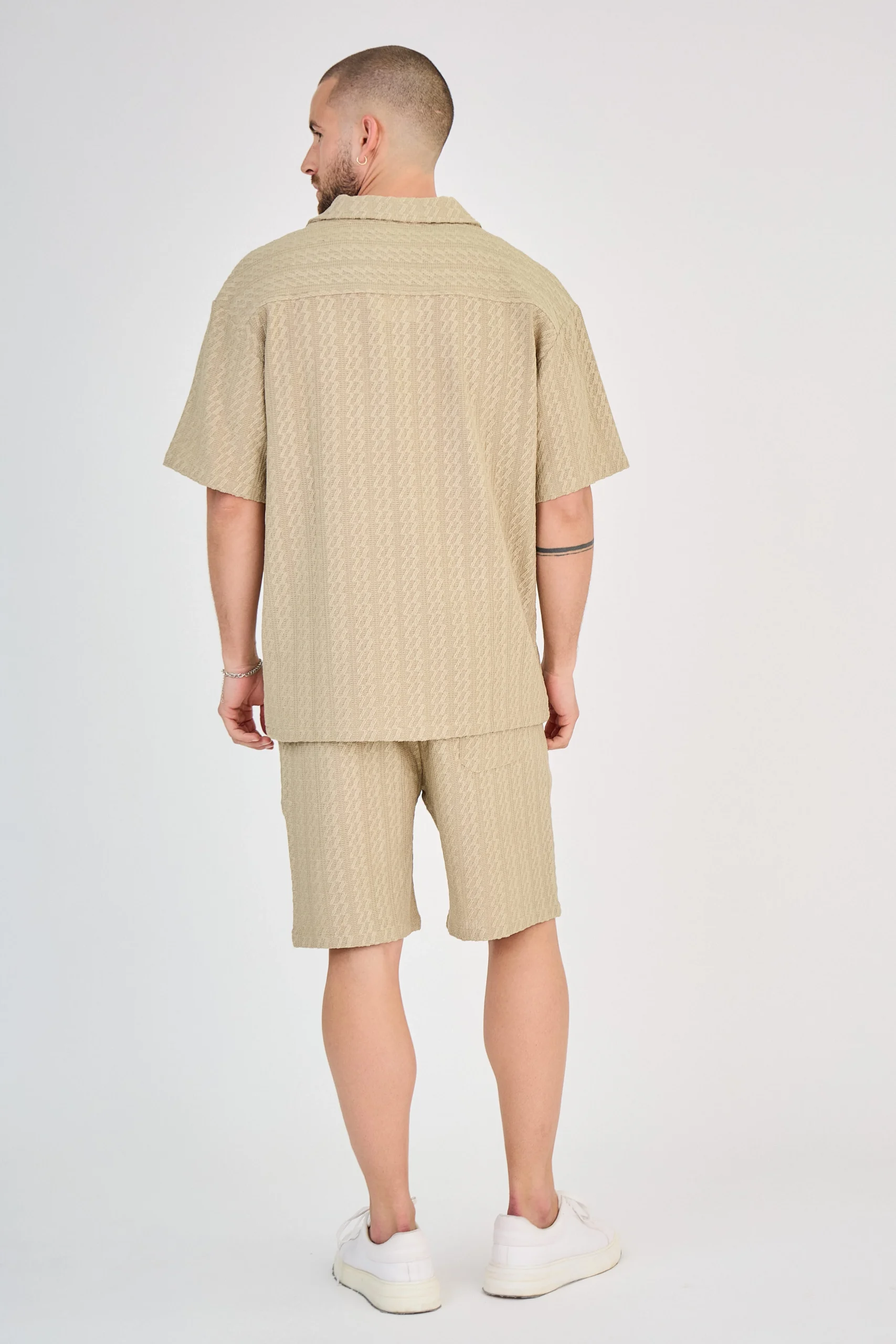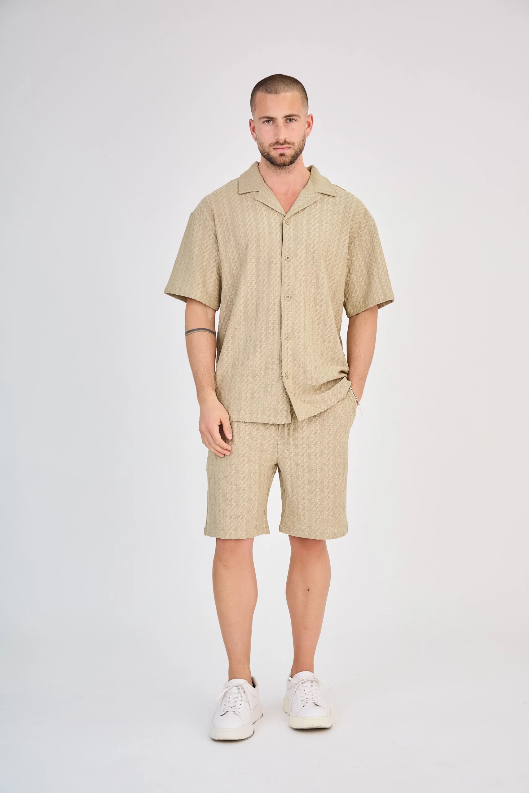 TAILLE ET COUPE Coupe droite et confortable Taille standard Prenez votre taille habituelle Taille mannequin : 1m80 Le modèle présenté porte une taille M COMPOSITION 95% Polyester ; 5% Élasthanne ENTRETIEN Lavage en machine à 30°C Repassage doux Ne pas utiliser de javel DÉTAILS PRODUIT – Chemise manches courtes texturée à col cubain – Short […]