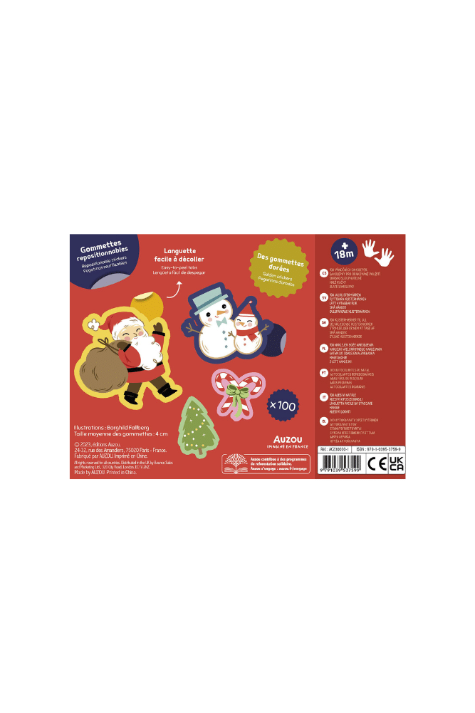 Un assortiment de 100 stickers de Noël repositionnables, idéal pour encourager l’imagination des tout-petits. Dotés d’une grande languette facile à soulever, ces autocollants peuvent être manipulés seuls par les enfants dès 12 mois.