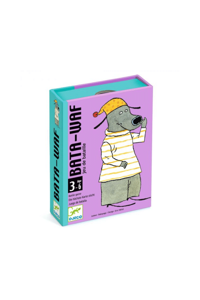 Le jeu de cartes Bata-waf de Djeco ! La variante de la bataille, le plus célèbre des jeux de cartes. Les chiens remplacent les traditionnelles cartes de figures telles que le roi, le valet et la dame. Poser votre carte, vos adversaires en feront autant et le plus grand chien gagne. Mais attention, si deux chiens sont de la même taille il y aura … Bata-waf ! Le jeu qui va beaucoup faire rire les petits-bouts. Ce jeu comporte 36 cartes et jouable de 2 à 4 joueurs, Bata-waf sera pratique à emporter partout pour s’amuser instantanément n’importe-où. Les règles…
