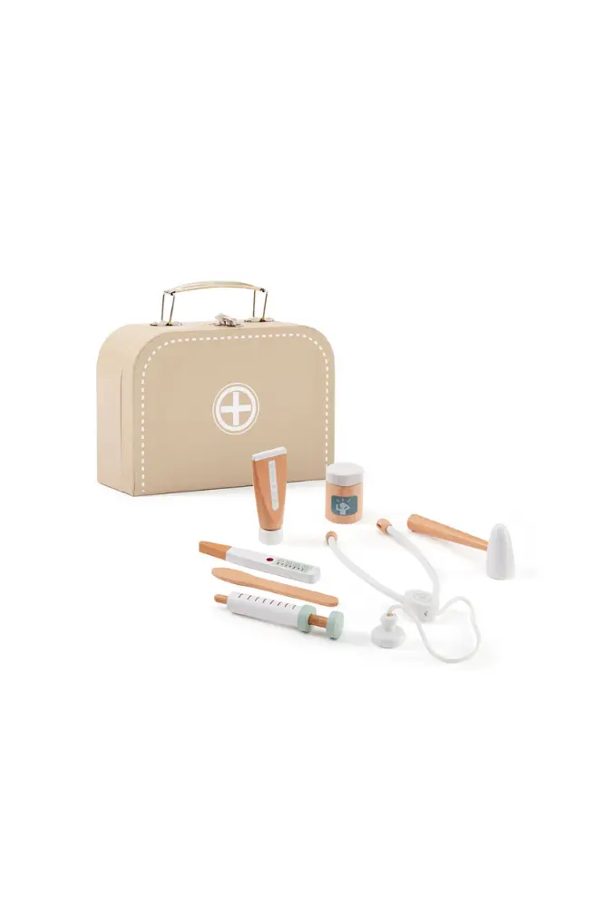 Les enfants adorent jouer au docteur ou à l’infirmière. Cet ensemble de docteur est un excellent moyen de stimuler leur imagination. La valise est équipée des essentiels pour être un bon docteur. La malette contient accessoires en bois : crème, seringue, marteau réflexe, médicament, thermomètre, stéthoscope et abaisse-langue.