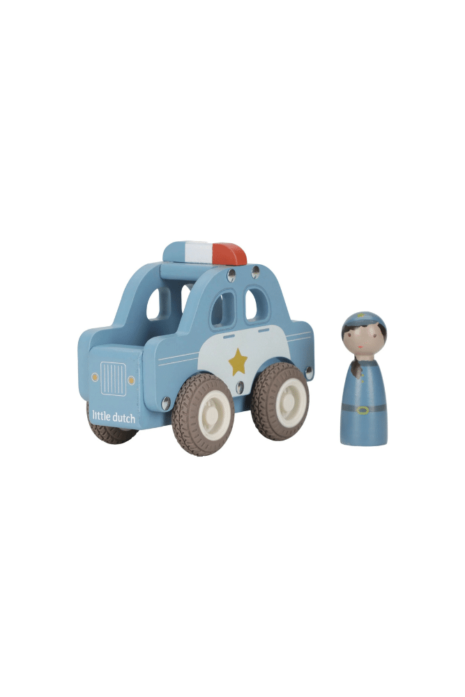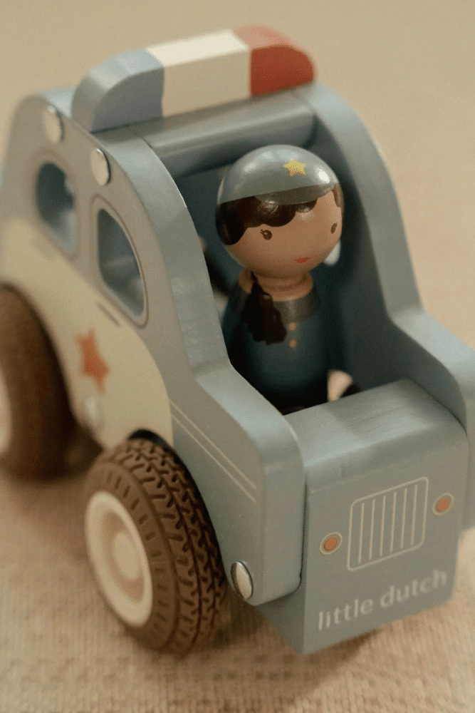 Découvrez la voiture de police en bois avec des roues en caoutchouc pour des trajets en douceur et une courageuse agente de police au volant. Votre enfant jouera des poursuites palpitantes et il mettra les bandits derrière les barreaux. Ce jouet voiture de police est parfait pour les jeux de rôle. Pour continuer l’aventure, découvrez le camion de pompier et l’ambulance.