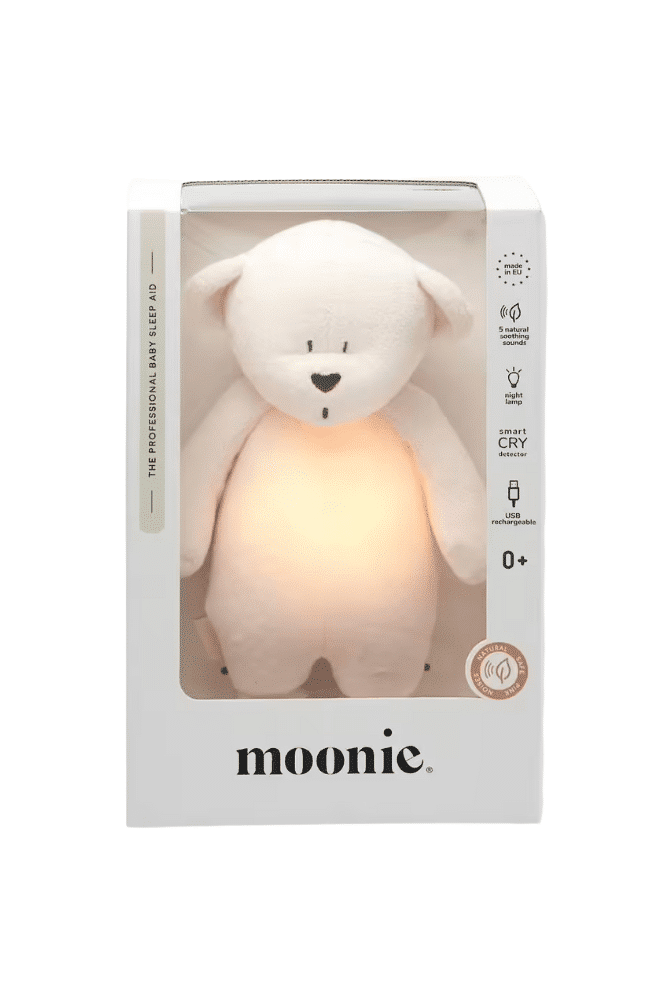 La peluche magique pour des nuits de rêve… entièrement fabriqué en coton bio ! Découvrez l’ourson magique Moonie au look vintage, une peluche bruits blancs qui apaisera le sommeil de bébé pour les nuits paisibles des parents ! Choisissez entre les sons apaisants ou la berceuse musicale : Dans le ventre de maman, Le vent, Un ruisseau sous les bois, Les vagues et La pluie. L’ourson magique Moonie est équipé d’un détecteur de pleurs, il émettra donc un son apaisant pour bébé lorsqu’il en aura besoin. Il est également équipé d’une veilleuse intégrée personnalisable pour rassurer bébé grâce à une…