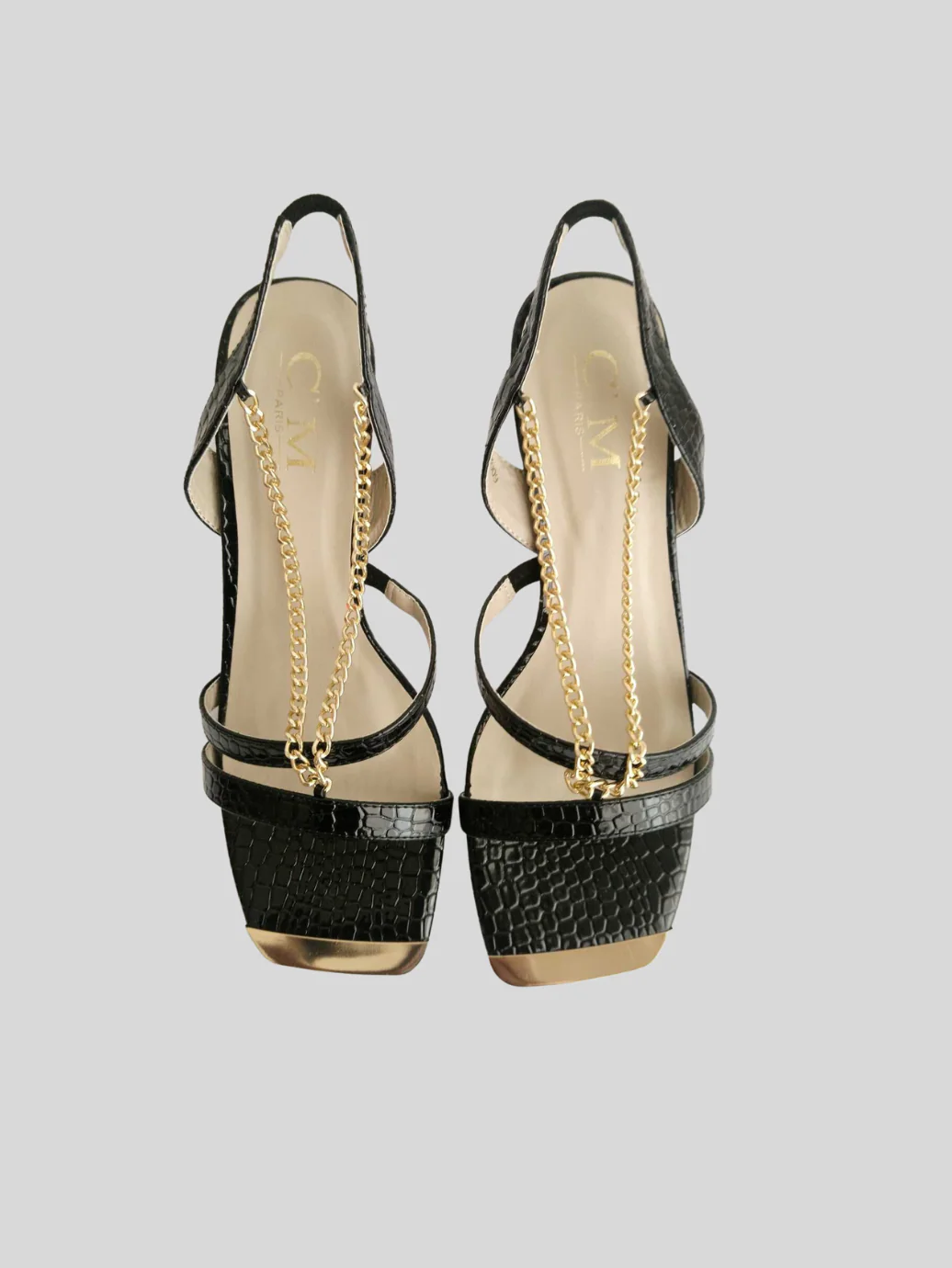 Mules noires à talon chic et branchées : un must-have! La touche finale pour compléter votre look. Avec une jolie chainette OR qui ne manquera pas d’apporter une touche d’originalité et de glamour à votre look. Misez sur elles, elles vous le rendra bien! 😉