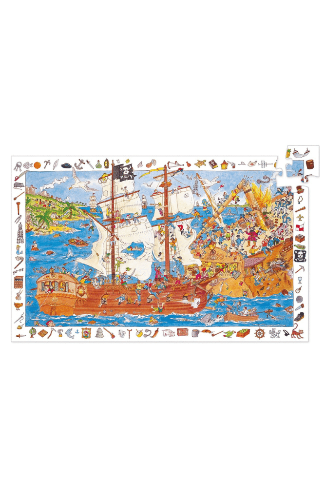 Le puzzle d’observation Pirates de Djeco composé de 100 pièces, un puzzle riche en détails et en surprises parfait pour les enfants dès 5 ans. Une fois le puzzle reconstitué, votre enfant pourra s’amuser à retrouver dans l’image centrale les éléments de la frise pour vivre de plus près la vie à bord de ce beau bateau. Un puzzle à faire et à refaire à volonté. A l’abordage!