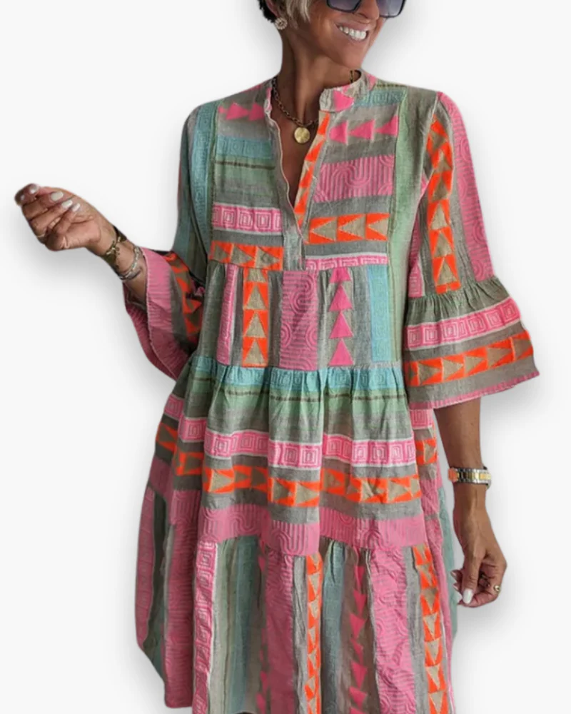Apportez une touche de fraîcheur et de légèreté à votre style avec cette robe bohème élégante à coupe ample. Son imprimé coloré et sa matière fluide en font un choix idéal pour vos journées estivales, vos escapades ou vos moments décontractés.