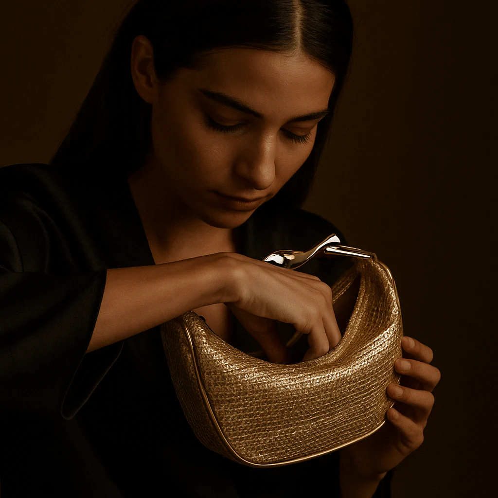 Sac Alma – Mini demi-lune tressée & anse dorée sculpturale