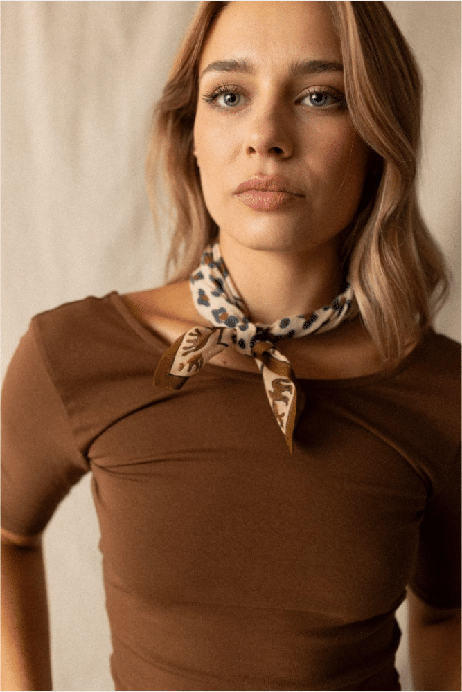Adoptez le foulard DUPITTA 50×50 cm en voile de coton et son imprimé léopard irrésistible. Léger et respirant, il se porte de mille façons : autour du cou, dans les cheveux ou accroché à un sac. Un accessoire félin et raffiné qui apporte caractère et élégance à toutes vos tenues.