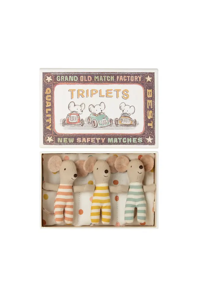 Une jolie boîte d’allumettes avec ces triplés qui dorment dans leur sac de couchage. Votre enfant pourra ainsi agrandir sa collection de petite souris Maileg.