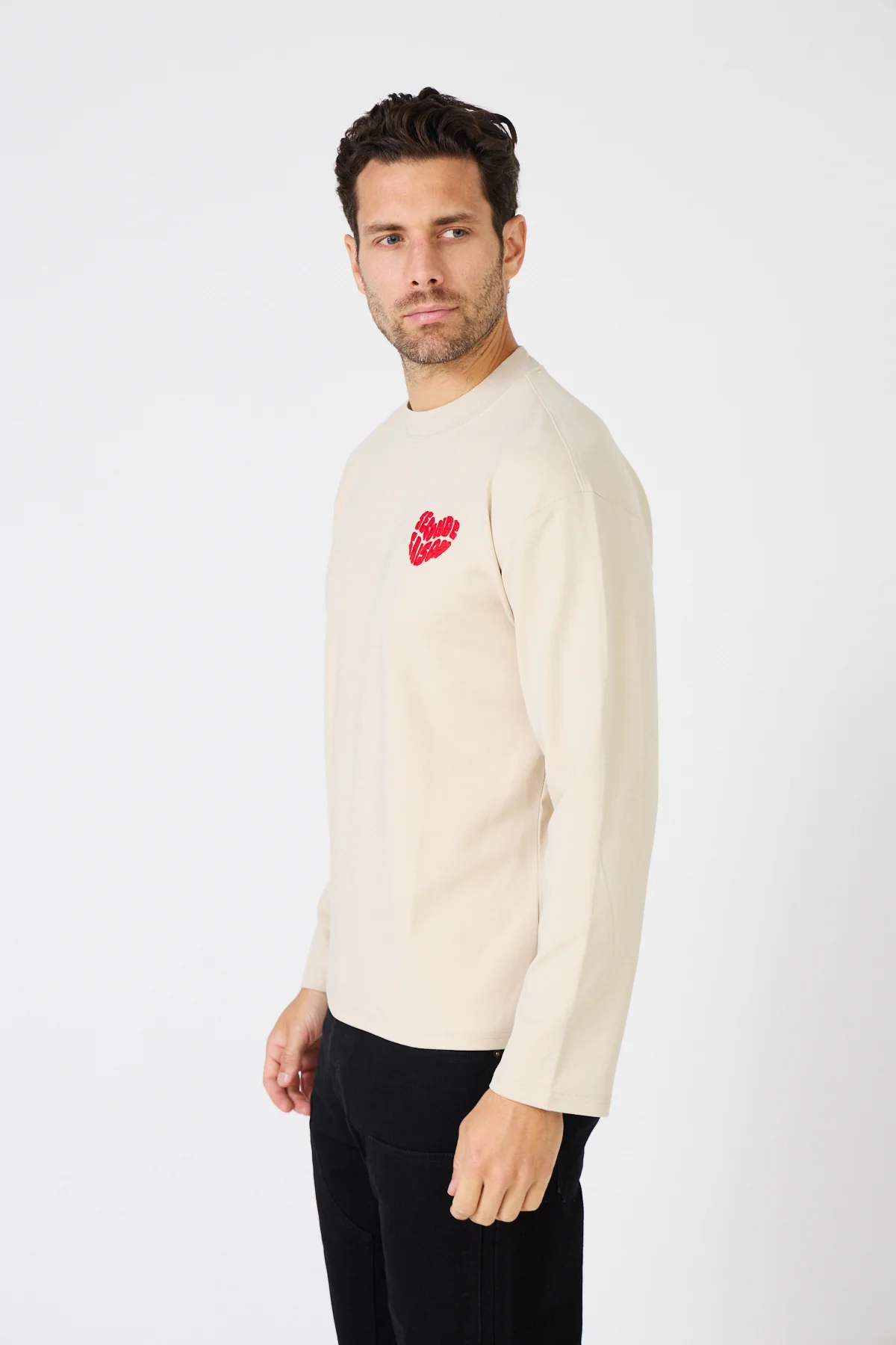 T-shirt à manches longues avec logo coeur, quintessence du vêtement essentiel moderne. Conçu pour offrir tenue structurée et douceur agréable, idéal pour les superpositions ou porté seul. Sa coupe oversize garantit confort et allure décontractée, avec des finitions soignées et intemporelles, parfait pour le streetwear minimaliste.